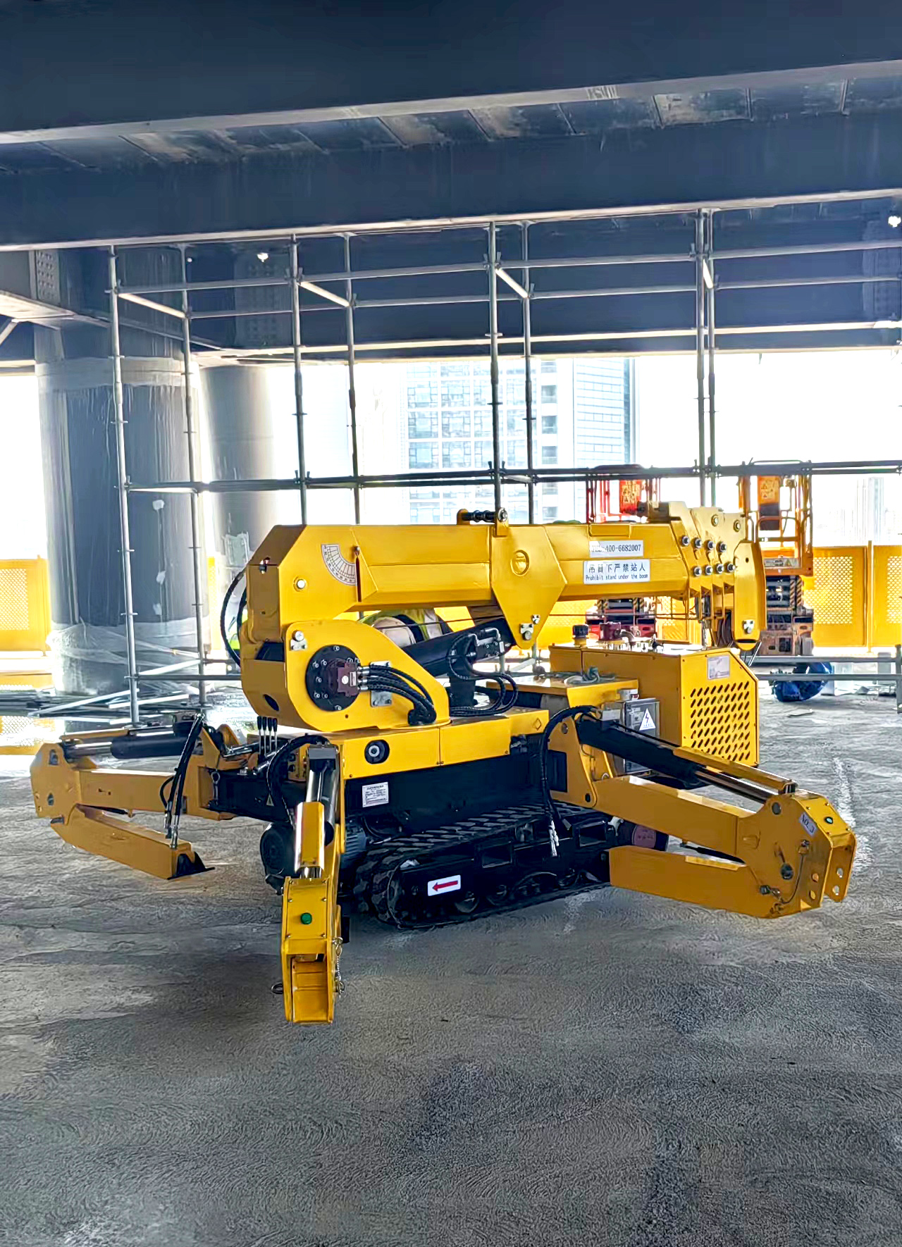 限于大厦升降梯空间和荷载重量有限,自重2.2吨的蜘蛛吊无法乘坐升降梯到楼顶。这时,科步专门派去进行产品培训指导的魏师傅提出可以把蜘蛛吊的4条支腿卸掉,把车体和支腿分别运送到楼顶再重新组装起来,并不影响施工。