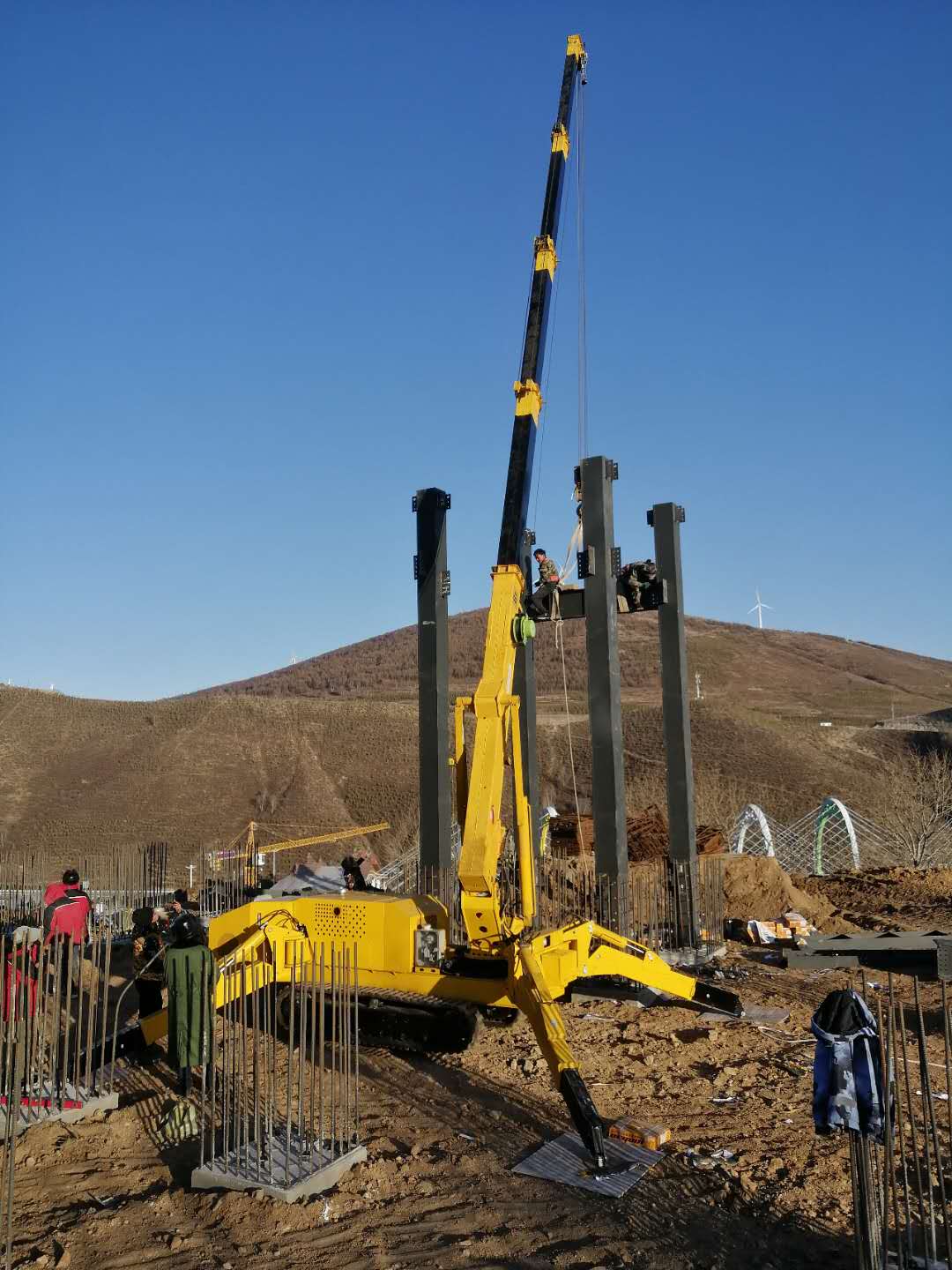 Kebu Spider Crane KB8.0 helps the construction of the 2022 Winter Olympic Games. The 8 tons spider crane has a maximum lifting weight of 8 tons and a maximum lifting height of 17.8 meters. It can walk on rugged dirt roads and climb 20° slopes. A hoisting artifact in a restricted field.